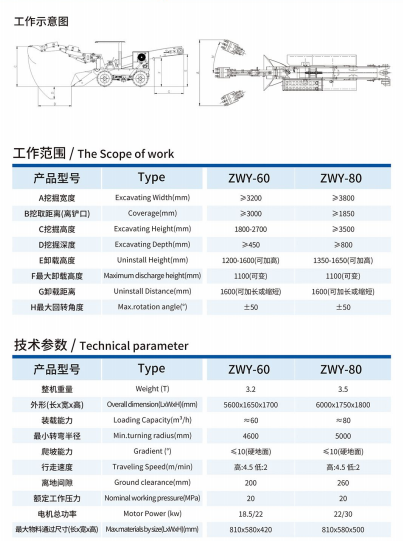ZWY-60/80 轮式输送带挖掘式装载机是一种连续生产的高效率出矿设备。主要用于空间狭窄的 洞采作业,如金属矿,非金属矿,引水巷道等。
